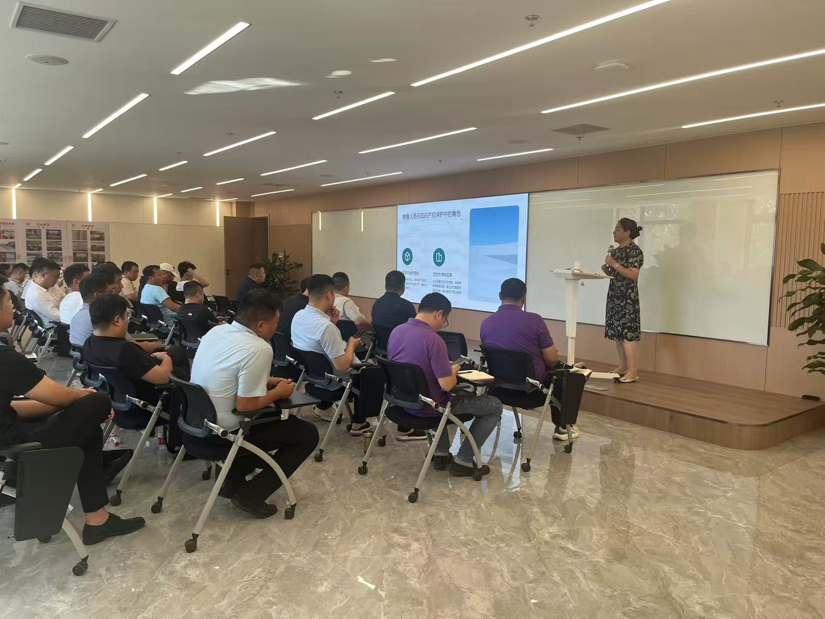 20251010日,我所王美华所长应邀前往江苏河马井股份有限公司为全体销售人员开展了一场以销售人员如何协助企业保护知识产权为主题的专题培训。此次培训旨在强化销售团队在知识产权保护中的角色认知,提升企业整体风险防控与侵权应对能力。